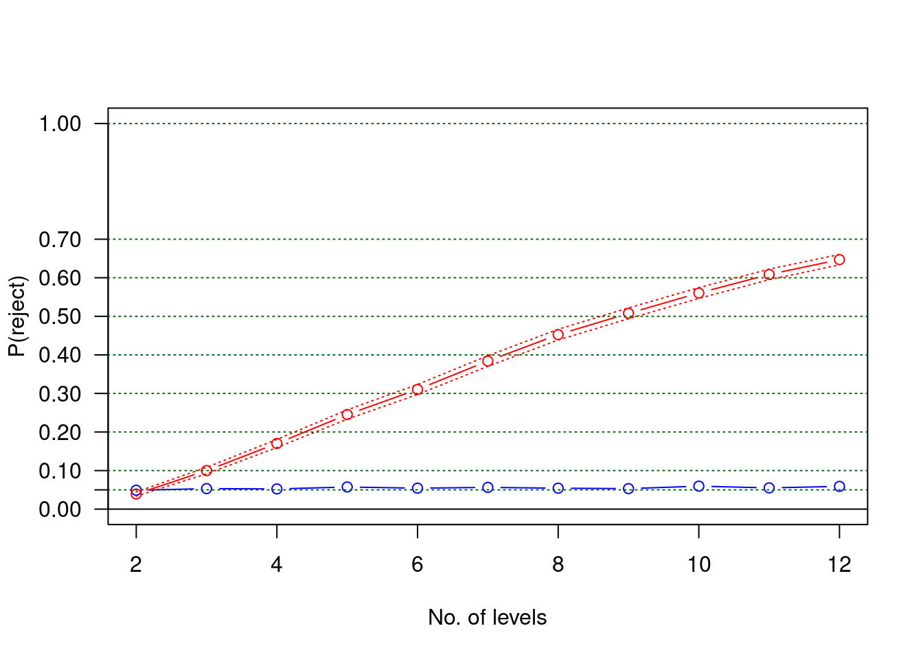 The blue line shows the overall (LRT) rejection probability as a function of the number of levels, and it stays almost constant at 0.05, as it should. The red line (with uniform 95% confidence limits) shows the probability of at least one “significant” contrast as a function of the number of levels, and it is OK for two levels, but then it quickly goes wild. We do no want to use a rule that has a 60% probability of Type 1 error (11 levels), do we?